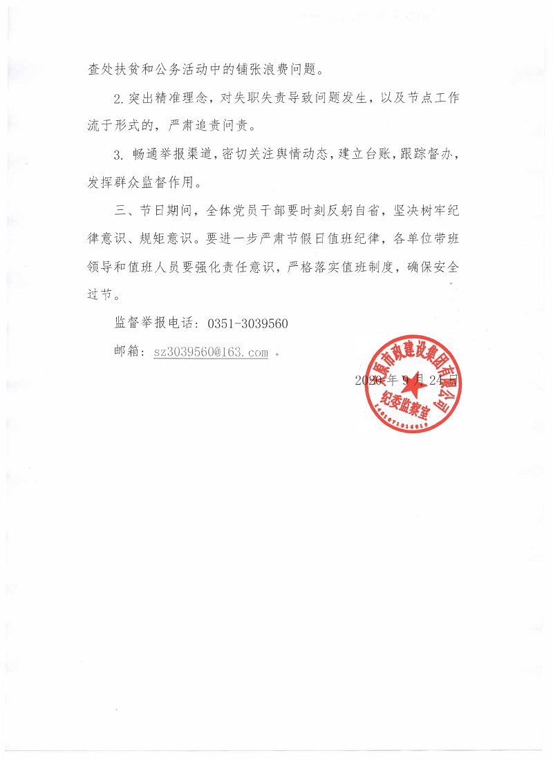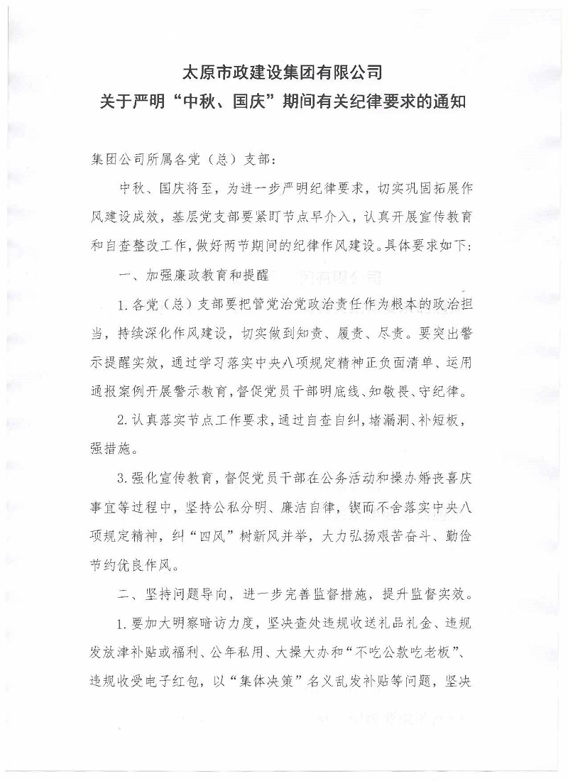 太原市政建設(shè)集團(tuán)有限公司關(guān)于嚴(yán)明“中秋、國(guó)慶”期間有關(guān)紀(jì)律要求的通知